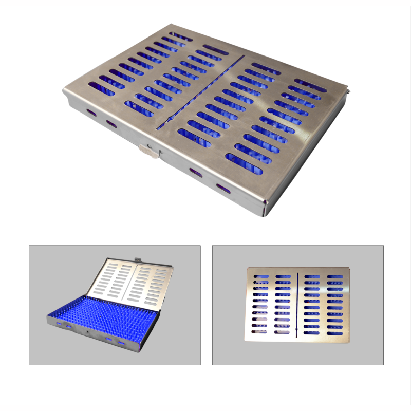 Sterilization Cassette designed to securely hold 6 or 12 dental instruments during cleaning and autoclaving. Available with Silicon Inserts or Full Silicon Mat for safe instrument retention. Durable, corrosion-resistant, and ideal for dental clinics and hospitals.